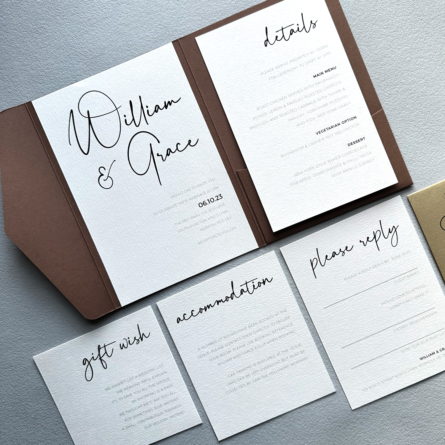 - Additional personalisations such as guest names, pre-printed envelopes, wax seals and envelope liners are available, please contact us for details